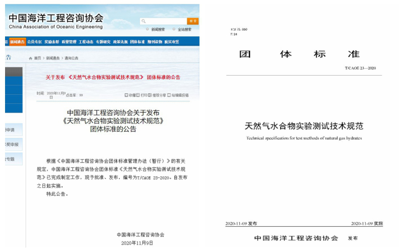 近日,中国海洋工程协会发布公告(中海协发〔2020〕7号),由中国地质调查局青岛海洋地质研究所研制的团体标准《天然气水合物实验测试技术规范》正式获批发布、实施,标准编号T/CAOE 23-2020。该标准是青岛海洋所科研人员2018年承担的海洋工程标准化建设课题(CCSOA-OEAS-2018-02)的成果,编写组在多年来天然气水合物实验测试工作的基础上,根据标准编制要求,广泛征求各方意见,反复修改完善了标准文稿,于2020年11月9日获批发布。