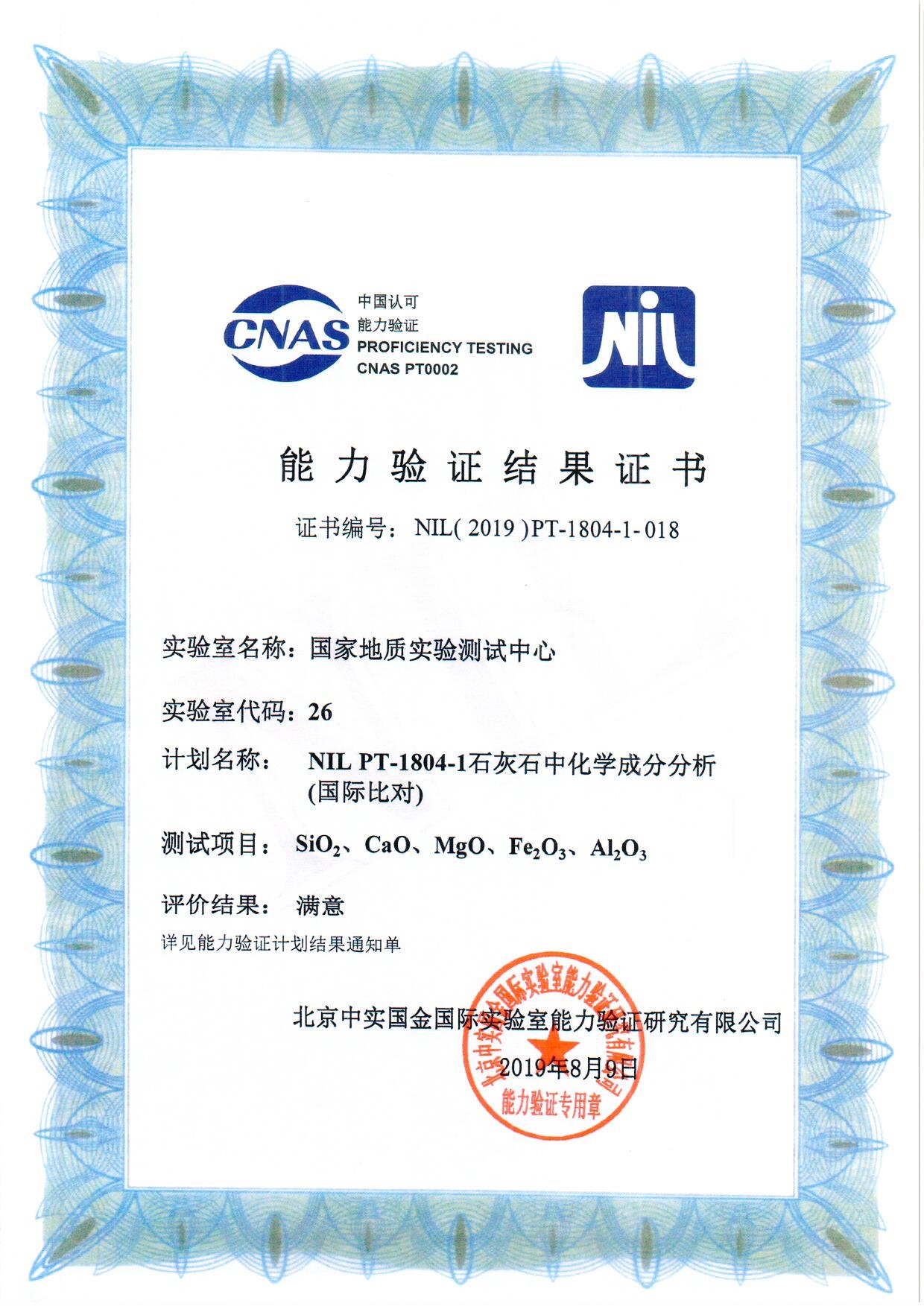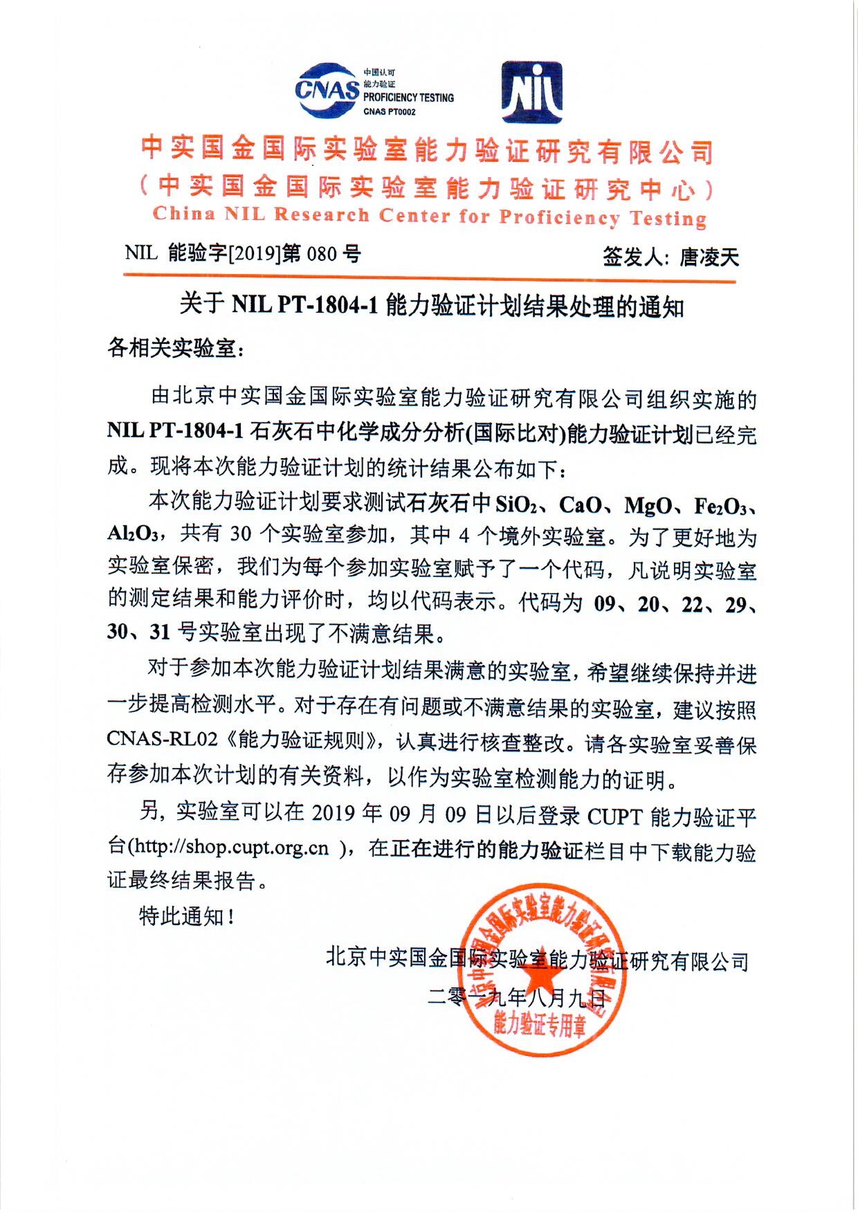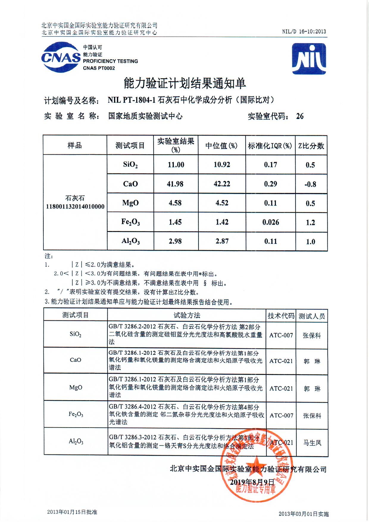 2019年5月,为检验实验室测试能力,加强质量控制,自然资源部中国地质调查局国家地质实验测试中心参加了北京中实国金国际实验室能力验证研究中心组织的《NIL PT-1804-1石灰石中化学成分分析(国际比对)》5种成分的能力验证计划。近日,获能力验证主办方通知,实验测试中心参加的5种成分分析全部取得满意结果。