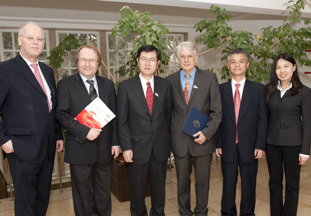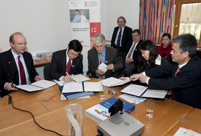 德方美茵茨大学副校长F?rstermann教授、美茵茨大学医学院院长Urban教授、德国前国防部长(现德中商业局董事长)Scharping先生、德国教育与科研部德中项目负责人Stiller博士、德方项目负责人美茵茨大学Müller教授,中方中国地质科学院副院长董树文研究员、国家地质实验测试中心副主任罗立强研究员、中方项目负责人国家地质实验测试中心王晓红研究员出席了签字仪式。美茵茨大学相关院系的领导及其它单位的合作者(如德国马普化学所的Jochum博士)和同行也出席了签字仪式。