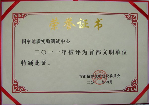 近日,首都精神文明建设委员会授予国家地质实验测试中心2011年“首都文明单位”荣誉称号,并颁发了荣誉证书和奖牌。