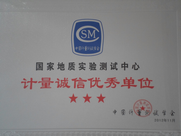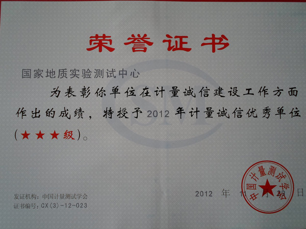2012年11月29日,“中国计量测试学会2012年度会员大会暨计量技术推广交流会”在广西南宁市召开,来自全国计量测试领域、行业分会、检测机构、工业企业、科研单位的约300名会员代表参加了这次大会。学会表彰了2012年计量诚信建设优秀单位。国家地质实验测试中心在对外检测服务工作中严格执行国家政策和有关法律法规,不受任何外界干扰和影响,充分保证了作为第三方检测机构的公正服务,再次被评为“中国计量测试学会计量诚信三星级(最高级)单位”,受到表彰。国家地质实验测试中心将一如既往,加强诚信体系建设和质量保证体系建设,进一步推进中心计量测试技术发展,为地质找矿突破和基础地质学研究提供分析测试技术支撑,为广大客户提供更优质、更快捷的服务,为我国经济社会发展做出新的贡献。