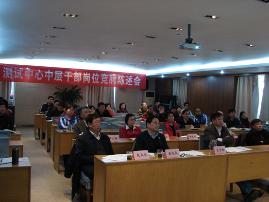 按照测试中心部分中层干部竞聘上岗工作安排, 12月7日上午,测试中心部分中层干部岗位竞聘陈述评议会在五楼会议室举行。会议由中心主任庄育勋主持,局人教部副主任安俊良、局人教部二处处长包永东、院常务副院长朱立新、院党群工作处处长徐丛荣、测试中心副主任吴淑琪、罗立强和沈建明出席会议,中心中层干部、职工代表共40人参加了陈述评议大会。