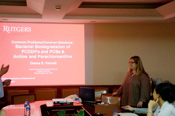 Donna Fennell博士作为国际知名环境微生物学家,发表论文300余篇,在相关学术领域有一定的国际影响力。Donna Fennell博士在报告上主要介绍了三部分内容:一是微生物在空气中的行为,即微生物在空气中的传播中对挥发性有机物的代谢作用;二是区分并生物降解复杂工业区沉积物中苯胺和对氯苯胺;三是厌氧还原去氯进行PCDD/Fs和PCBs的生物修复。参加报告的科研人员与Donna Fennell博士积极地互动,针对一些具体的科研问题进行了热烈地探讨。