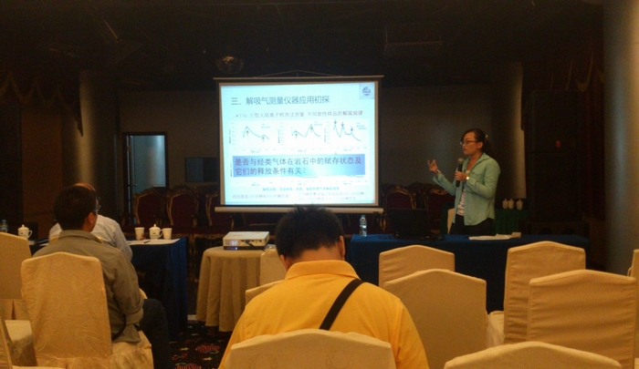 汪双清研究员以《轻烃氧化菌生物标志物在海洋油气勘查中的应用前景—以渤海绥中36-1油田为例》为题作大会特邀报告,该研究成果获得相关研究领域学者的一致好评。秦婧作分会报告《页岩气解吸气量测试技术及其改进》,与在场专家学者就解吸仪器设计应用前景及未来研究方向进行深入讨论,并获得“青年优秀论文奖”。