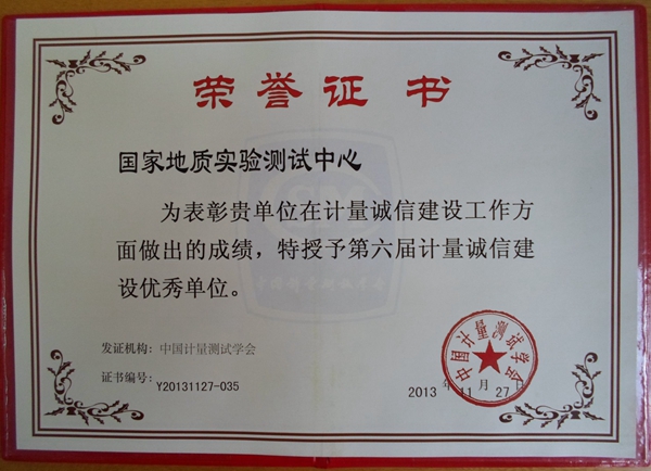 中国计量测试学会表彰了第六届计量诚信建设优秀单位和先进单位。国家地质实验测试中心在对外检测服务工作中严格执行国家政策和有关法律法规,不受任何外界干扰和影响,充分保证了作为第三方检测机构的公正服务,被授予“第六届计量诚信建设优秀单位”称号,受到表彰。