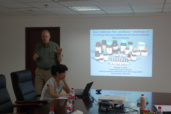 研讨会上,Stephen A. Wise博士做了题为“环境标准物质”的学术报告,就美国NIST概况和主要研究方向及其40多年来在环境标准物质方面的研究成果及进展做了详细介绍,安子怡代表中心标准化室简要介绍了中心近年来标准物质和标准方法研制成果及主导能力验证的进展。之后双方就环境有机污染物标准物质及测定方法、大气污染标准物质和纯度标准物质研制、不确定度评定等双方共同关心的问题进行了探讨。