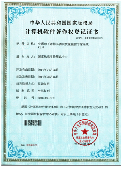 近日,由国家地质实验测试中心依托地质调查工作项目《地下水测试技术能力建设与质量监控》主持开发的《全国地下水样品测试质量监控专家系统V1.0》,获国家版权局颁发的计算机软件著作权登记证书(软字等字第0903853号)。