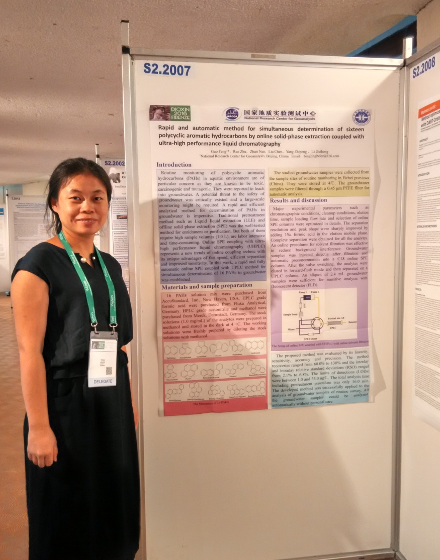 郭峰博士代表实验测试中心参加了本次大会,以报展形式展示了中心在地下水有机污染物全自动在线固相萃取与超高效液相色谱联用分析方面的最新研究成果,并与国内外知名专家学者就新型POPs分析方法、污染特征、生态环境地球化学行为与环境毒理健康等方面进行了深入交流。中心在地下水和土壤中POPs等有机污染物的相关研究也引起国内外同行的广泛关注,这必将对今后中心深入开展相关研究产生积极影响。