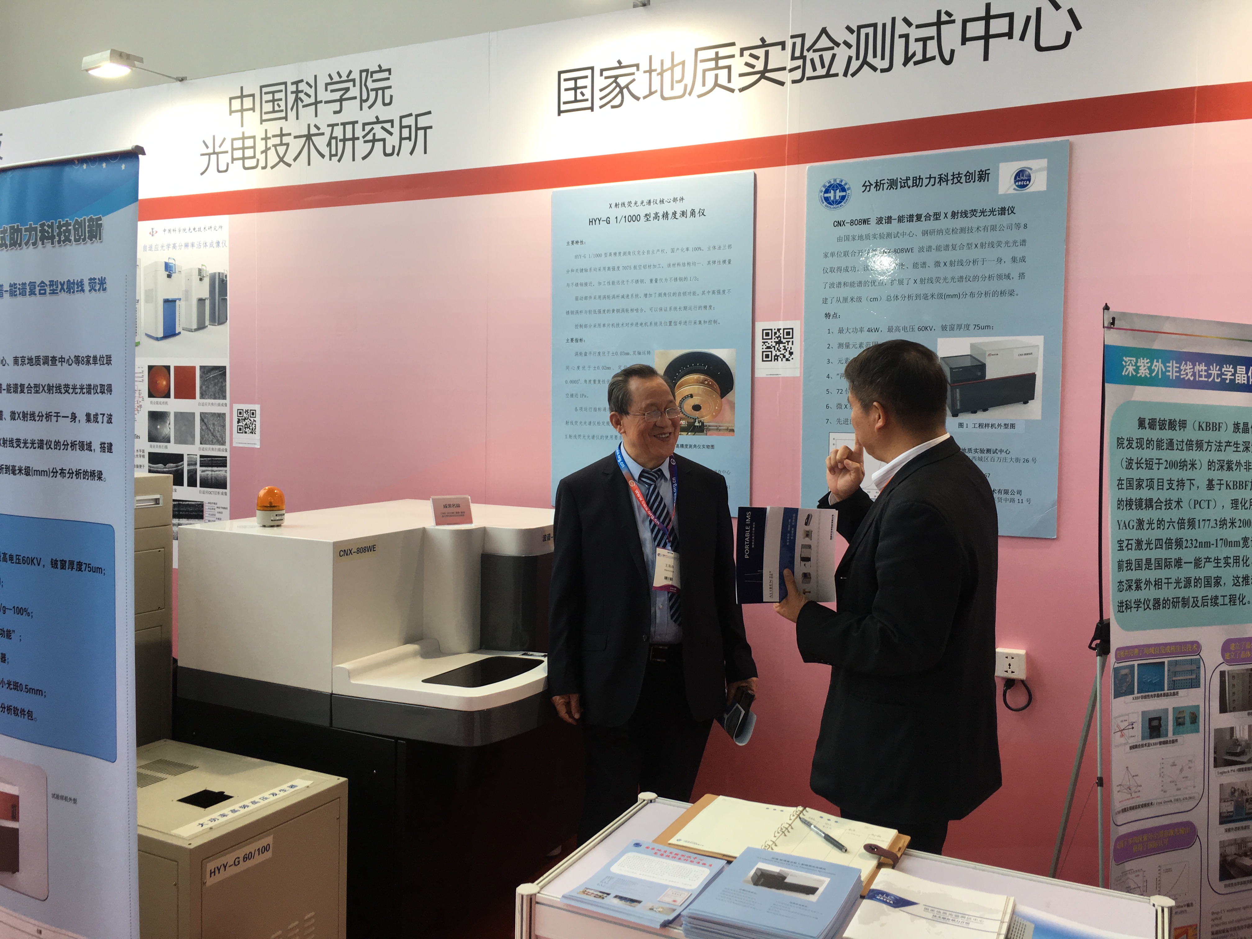 研发团队本次主要展出的仪器是“CNX-808WE型波谱-能谱复合型X射线荧光光谱仪”及核心关键部件“HYY-G 60/100型大功率高频高压发生器”,该套仪器是实验测试中心2012年牵头承担的国家重大科学仪器设备开发专项阶段成果,既体现了波谱和能谱的特点,又扩展了X射线荧光光谱仪的分析领域,是集波谱、能谱、元素分布分析(三项分析功能)于一身,搭建了从厘米级总体分析到毫米级分布分析的桥梁。具有制样简单、分析精度高、准确度好、成本低、相对环保、能同时对多元素快速分析等优点,能满足环境与地质调查、钢铁、建材、矿山、新材料等分析领域的需要。