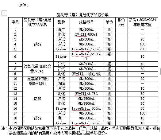 2.招标内容:本次招标旨在选择合格的供应商,按照需求提供符合国家相关法律法规要求的易制毒易制爆危险化学品试剂(包括但不限于硝酸、高氯酸、过氧化氢、硫酸、盐酸等试剂)。具体化学品清单及规格型号详见附件。